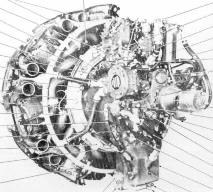 Wright Cyclone 1300, 1820: 9cyl. 2600: 14cyl. Pratt&whitney Wasp or Hornet: 9 cyl. Twin wasp: 18 cyl. R4360: 28 cyl. Bristol Pegasus, Mercury : 9 cyl. Bristol Centaurus: 18 cyl. Hercules-Bristol N734, N758, N791: 14 cyl. Lycoming R680 9 Cyl. Voir les moteurs |
